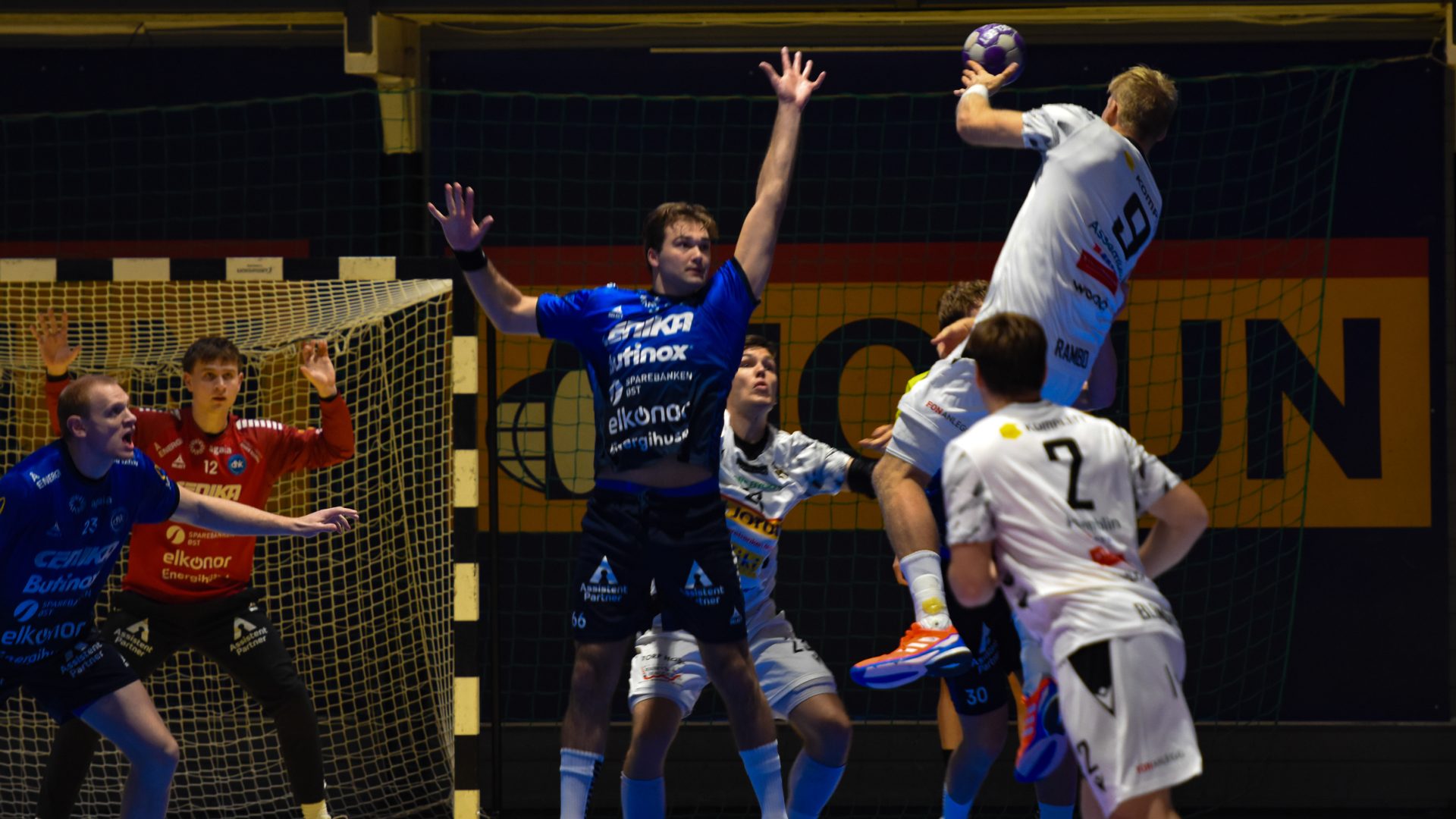 August Lind Oma har regien i DHKs angrepsspill, både i seks mot seks, og syv mot seks. Denne gangen ble han effektivt stoppet tidlig i angrepene av sterke Runar-forsvarere. Her er det Tobias Rivesjö og Sander Myklebust som i fellesskap har fanget ham opp på armene.
